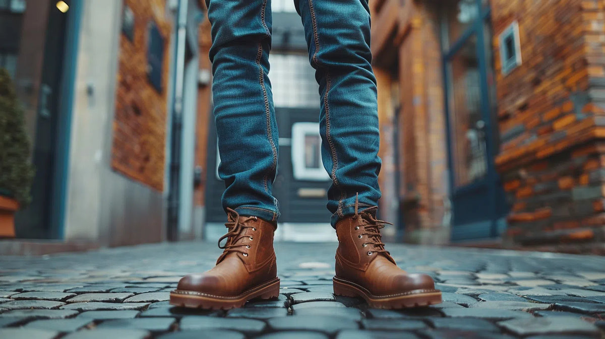 Man in indigo raw denim jeans, white tee, chestnut boots, outdoor urban setting. Spring season.