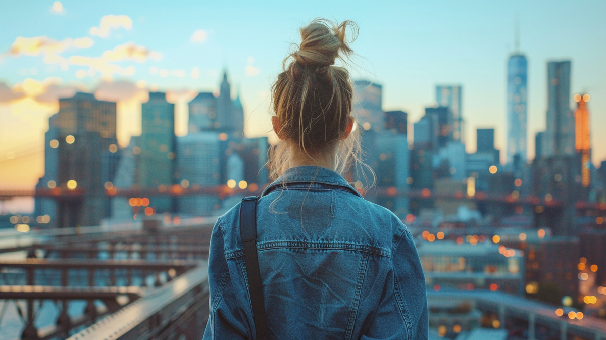 Women's ripped jean jackets in diverse styles and colors, featuring blue, light-wash denim, and vibrant pink designs. Summer season. French female. Northern Lights, Fairbanks, AK city background.